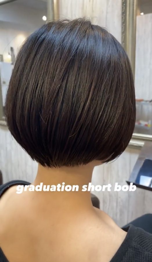 低めのウェイト(丸み位置)で、自然に前側が長くなるような前下がりラインのグラデーションショートボブです。