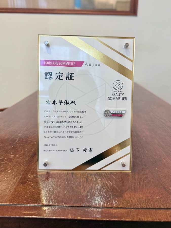 Aujuaは、私たちが普段からトリートメントでお世話になっているMILBON(ミルボン)のブランド。そのケア知識や毛髪科学、カウンセリング力などを深く学んだ人に与えられる資格が「Aujuaソムリエ」なんです。